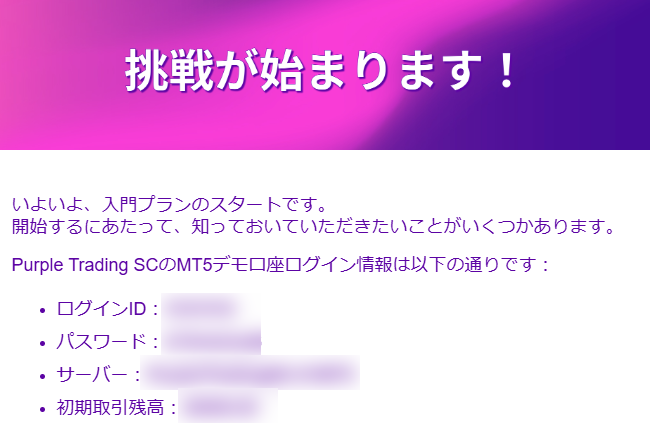 ※ダウンロードが完了すると、登録したメールアドレスに購入したチャレンジ口座へのログインID・パスワードが発行されるので、それをチェックしてログインしましょう。